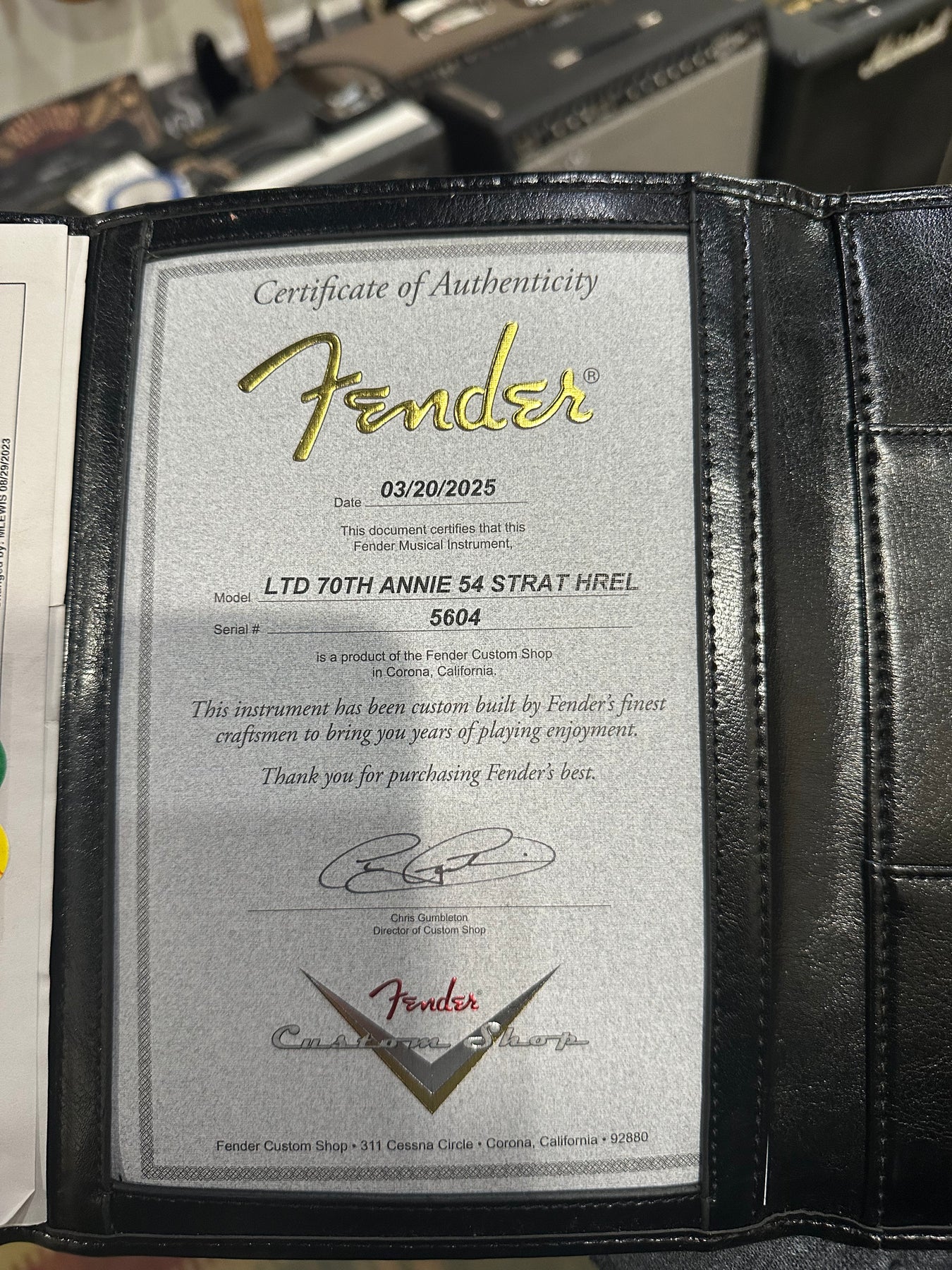 Fender Custom Shop 70th Annie '54 Stratocaster Serial No. 5604. This guitar is in Mint condition with all documentation, as shown. Includes original case and accessories.
